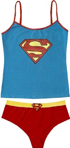 These camisole and panty sets for women are made to resemble a SuperGirl outfit. The blue top has the 'S' SuperGirl logo and the panties are red with gold trim and also have an 'S' logo.